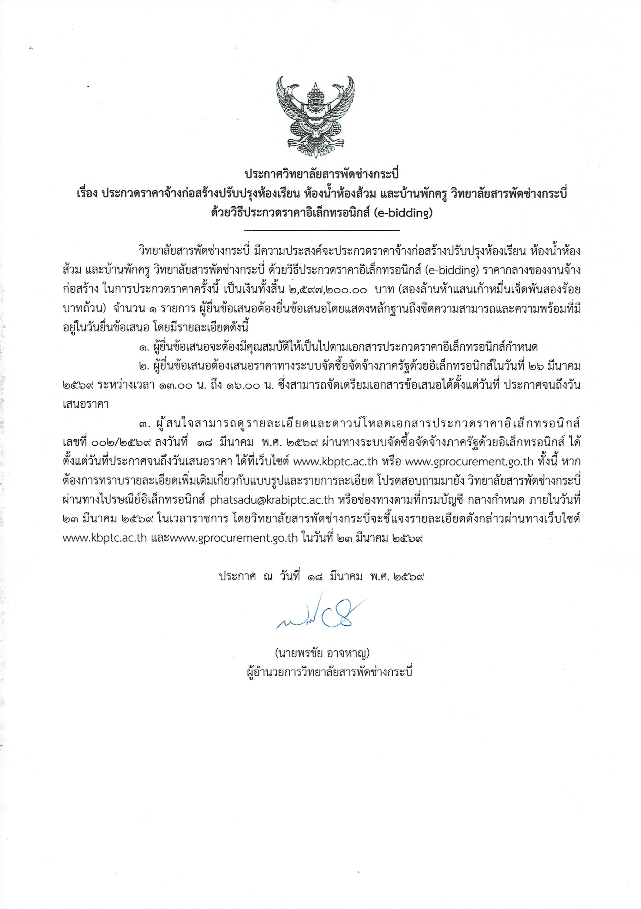 ประกวดราคาจ้างก่อสร้างปรับปรุงห้องเรียนห้องน้ำห้องส้วมและบ้านพักครูวิทยาลัยสารพัดช่างกระบี่