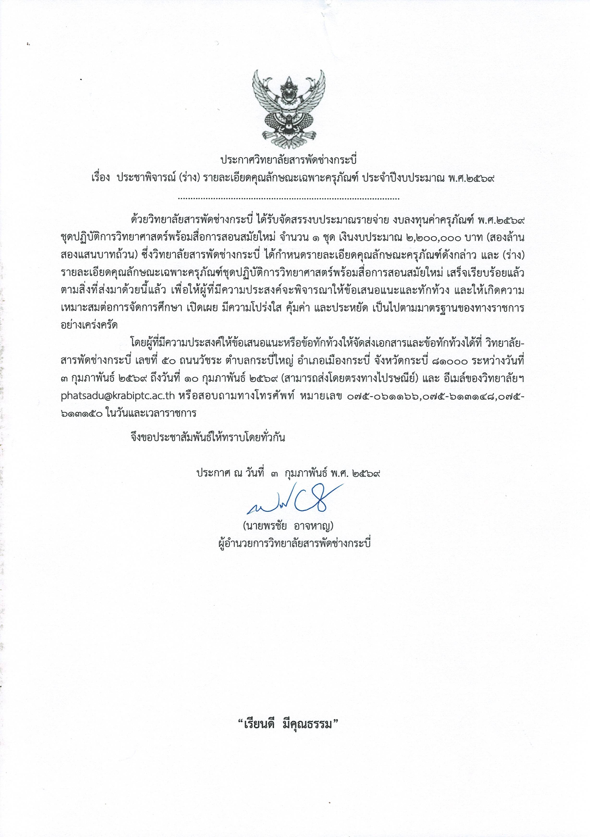 ประกวดราคาจัดซื้อชุดปฏิบัติการวิทยาศาสตร์พร้อมสื่อการสอนสมัยใหม่วิทยาลัยสารพัดช่างกระบี่